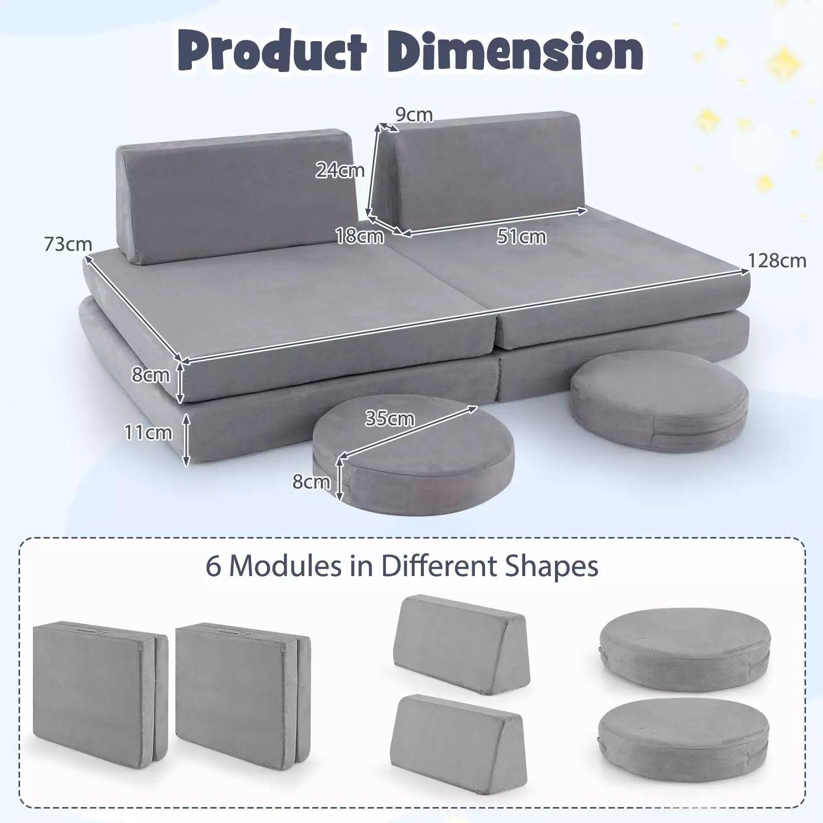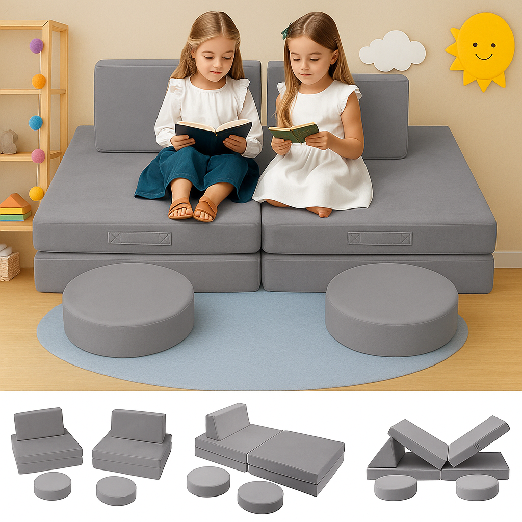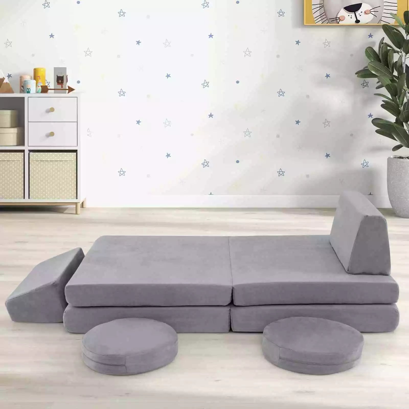 Modular Design: The sofa is made of lightweight, foam-filled cushions that kids can rearrange into endless shapes – from cozy couches and loungers to castles, forts, tunnels, and obstacle courses.